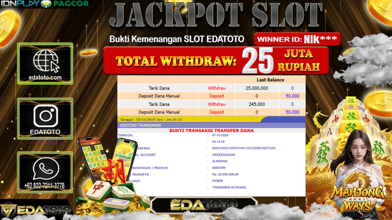 Selamat Kepada Pemilik user ID : Nik*** Hari/Tanggal : Selasa / 5, November 2025 Jackpot : Rp. 25,000,000 JT Withdraw :25,000,000 . . .