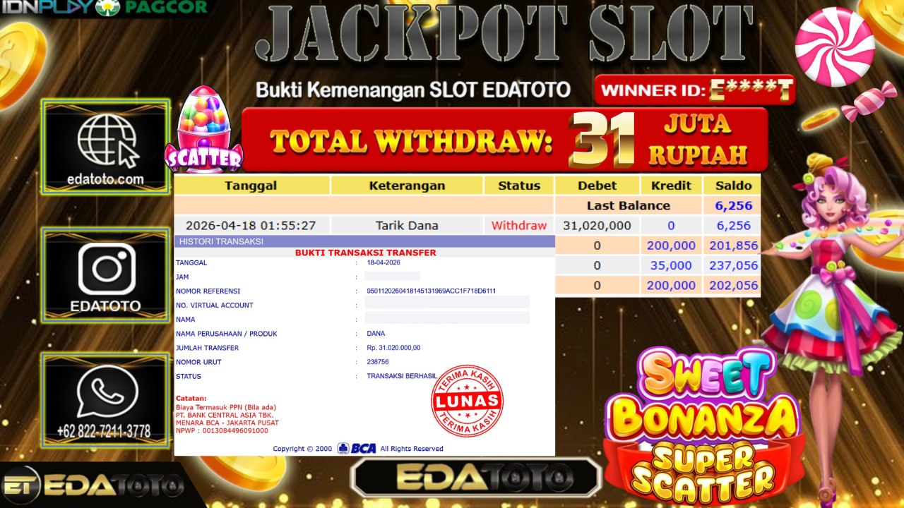Selamat Kepada Pemilik user ID : E****T Hari/Tanggal : Sabtu / 18 APRIL 2026 Jackpot : Rp, 30,000,000 JT Withdraw . . .