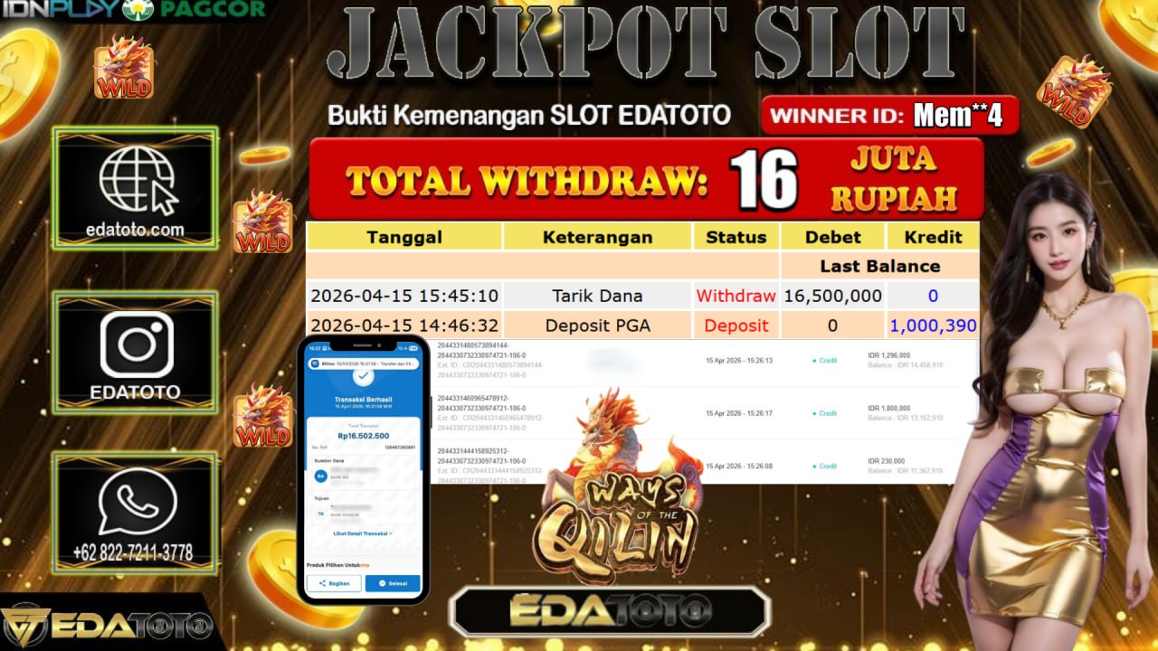 Selamat Kepada Pemilik user ID : Mem**4 Hari/Tanggal : Rabu / 15 APRIL 2026 Jackpot : Rp, 16,000,000 JT Withdraw . . .