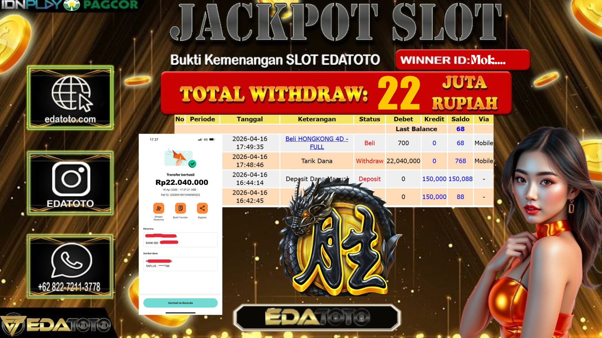 Selamat Kepada Pemilik user ID : mok*** Hari/Tanggal : Kamis/ 16 APRIL 2026 Jackpot : Rp, 22,000,000 JT Withdraw : . . .