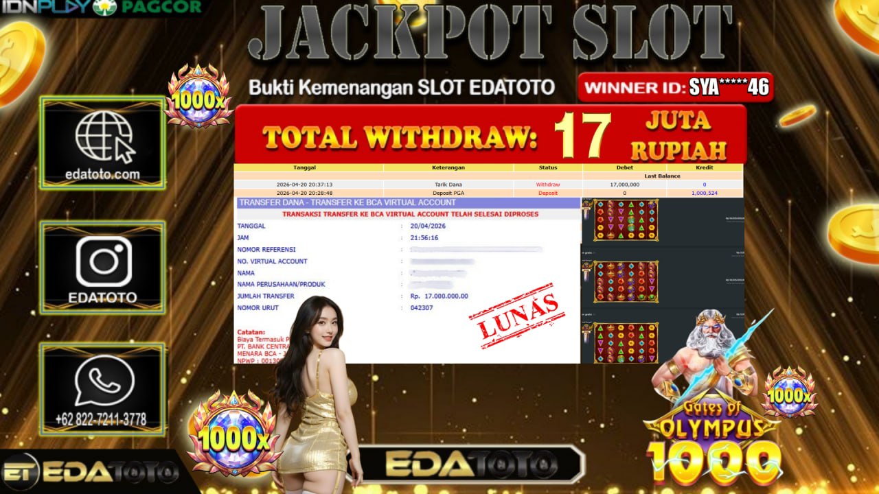 Selamat Kepada Pemilik user ID : SYA*****46 Hari/Tanggal : Senin / 20 APRIL 2026 Jackpot : Rp, 17,000,000 JT Withdraw . . .