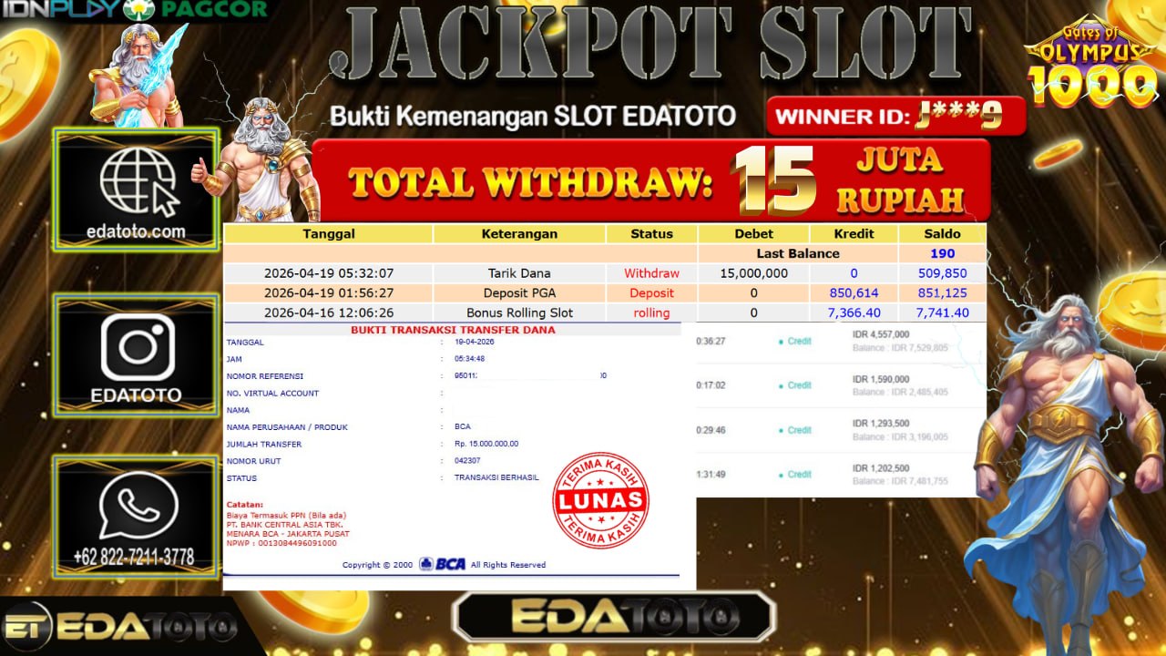 Selamat Kepada Pemilik user ID : J***9 Hari/Tanggal : Minggu / 19 APRIL 2026 Jackpot : Rp, 15,000,000 JT Withdraw . . .