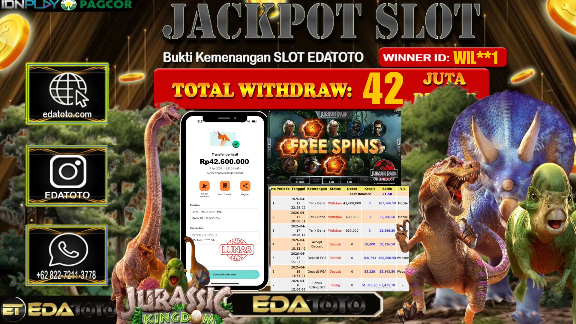 Selamat Kepada Pemilik user ID : WIL**1 Hari/Tanggal : Jum’at / 17 APRIL 2026 Jackpot : Rp, 36,000,000 JT Withdraw . . .