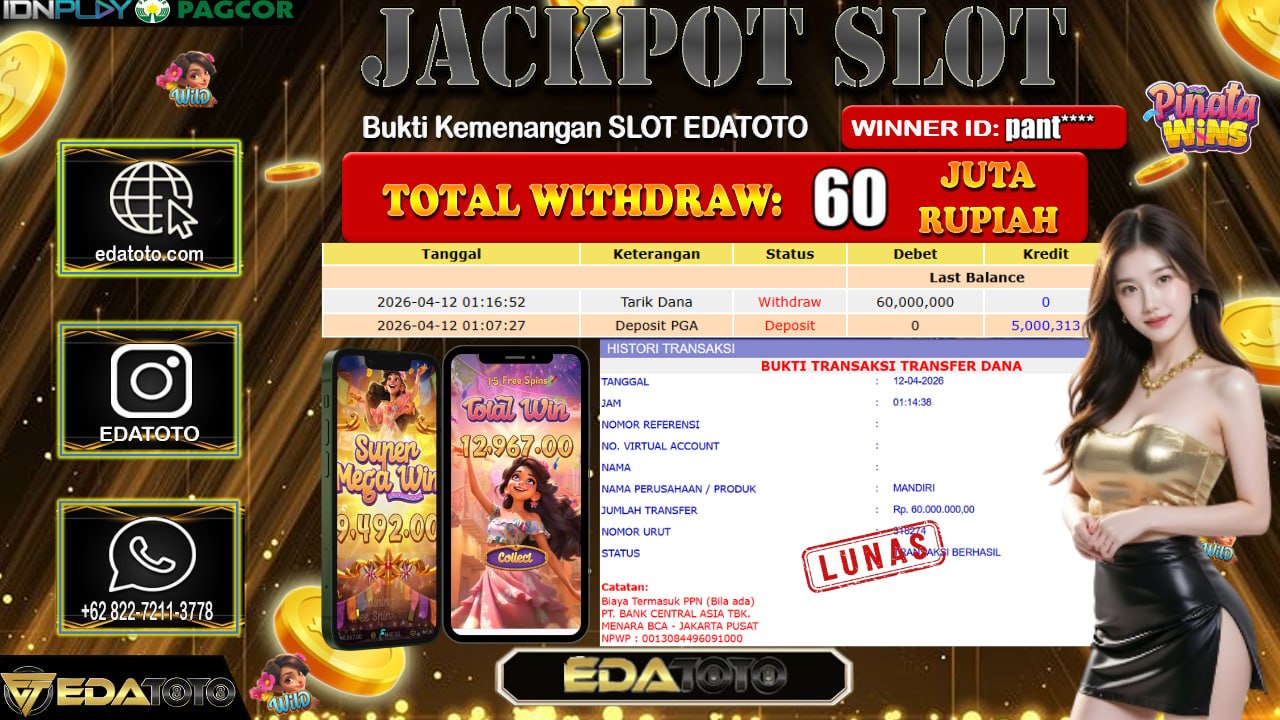 Selamat Kepada Pemilik user ID : pant**** Hari/Tanggal : Minggu / 12 APRIL 2026 Jackpot : Rp, 54,458.015 JT Withdraw . . .