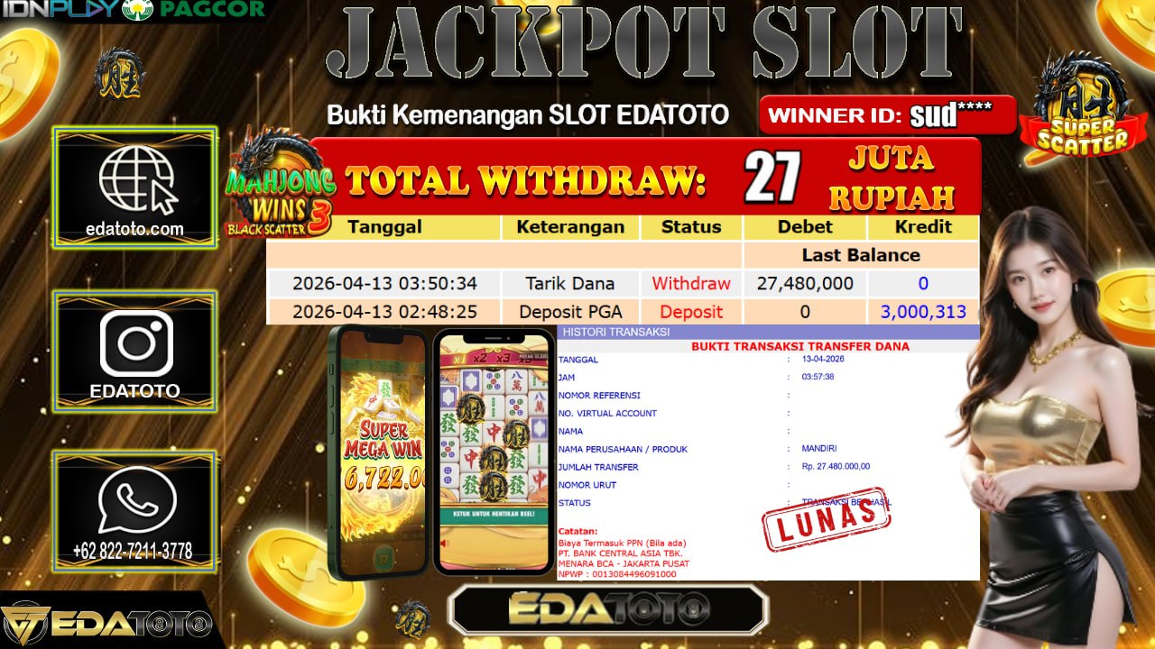Selamat Kepada Pemilik user ID : A****23 Hari/Tanggal : Senin/ 13 APRIL 2026 Jackpot : Rp, 25,855.561 JT Withdraw : . . .
