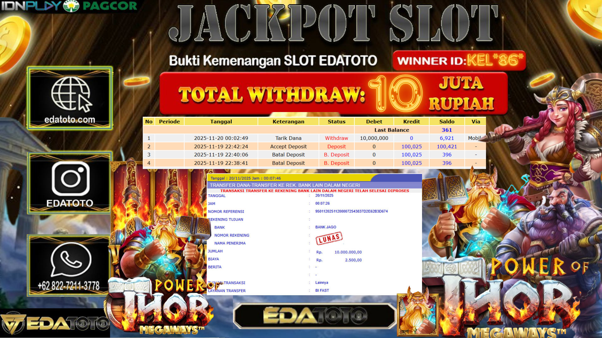 Selamat Kepada Pemilik user ID : ULAR*** Hari/Tanggal :Sabtu / 20, November 2025 Jackpot : Rp. 9,000,000 JT Withdraw :10,000,000 JT . . .